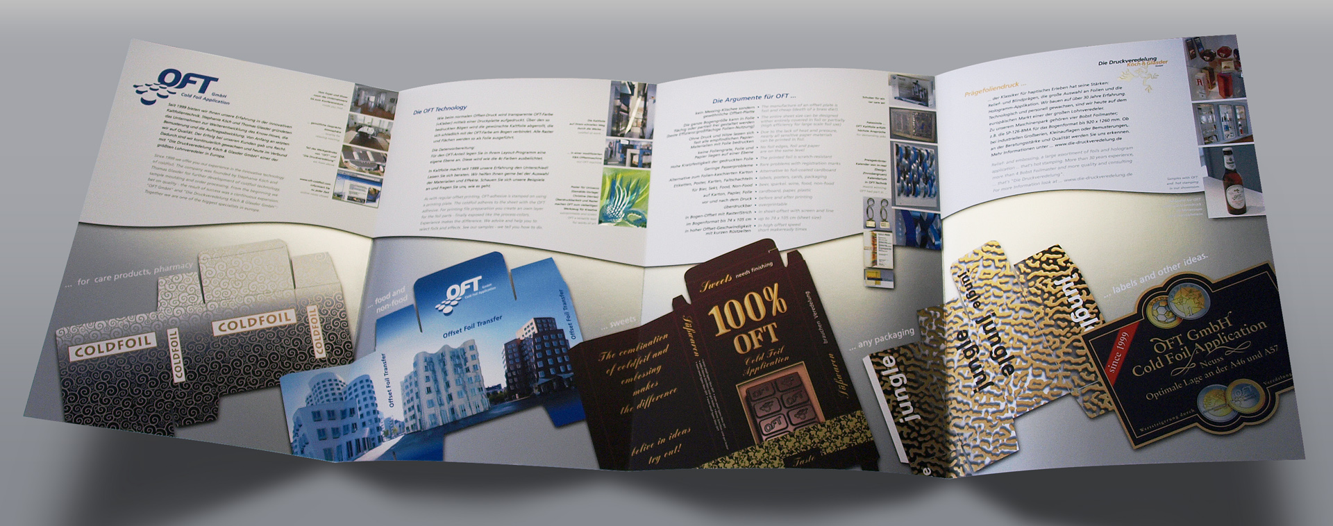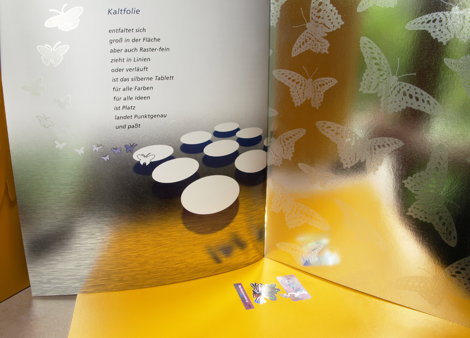Die Gestaltung mit Kaltfolie bietet große Freiheiten. Ob große Flächen oder feine Strukturen, die Oberfläche bleibt glatt und ist überdruckbar.