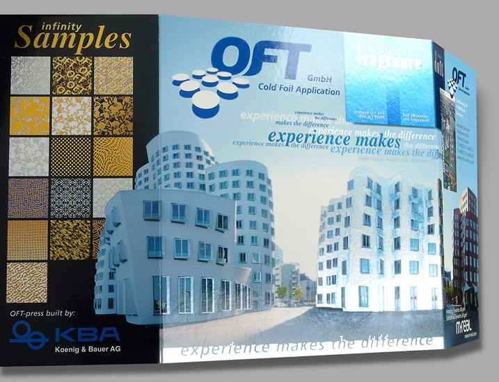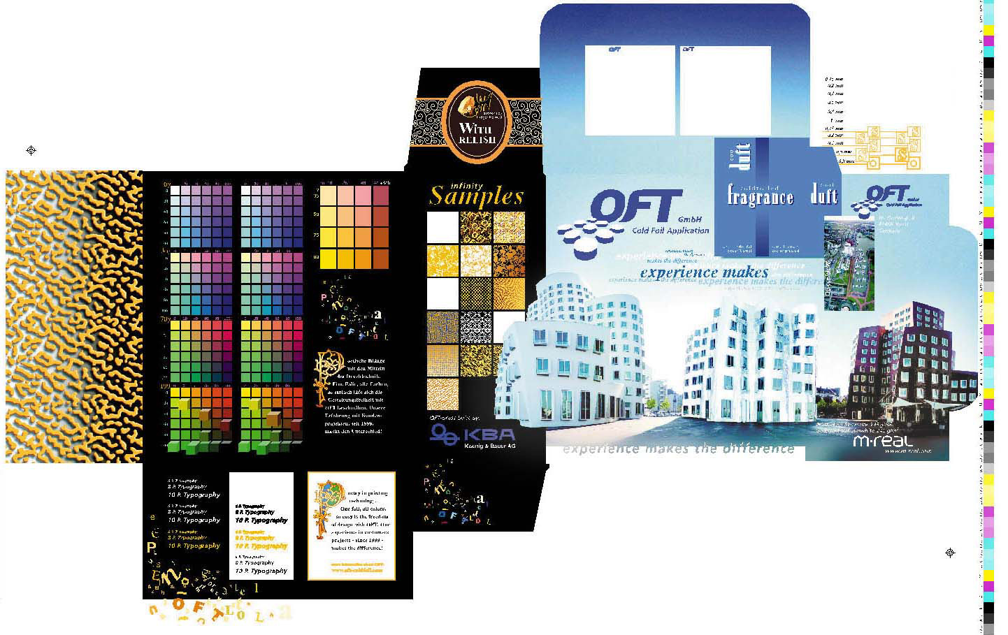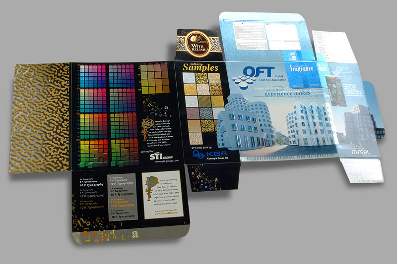 Für den OFT-Anteil generieren Sie in Ihrem Computer-Layout-Programm eine eigene Ebene. Diese wird als eigene "Farbe" wie die übrigen 4c-Farben ausbelichtet, jedoch in einem gröberen Raster - falls Sie Halbtöne einsetzen (max. 30l/cm). Die Ebenen zeigen wir hier exemplarisch an unserer Muster-Packung: |