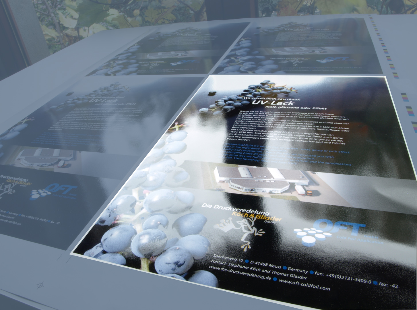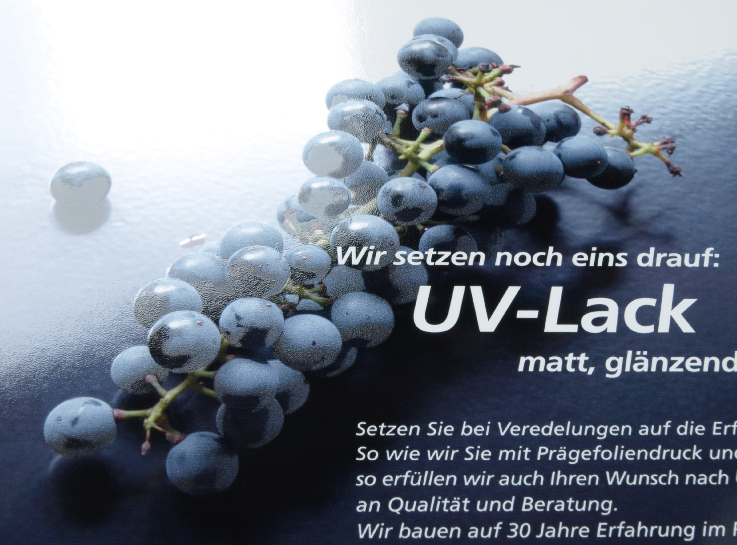 Mit einem speziellen Primer wird eine partielle Gestaltung aufgedruckt, auf der der anschließend vollflächig aufgetragene Hochglanzlack abperlt. An den unbehandelten Stellen (ohne Primer) bleibt der Lack hochglänzend stehen. Dadurch bekommt man in den normalerweise zerfließenden Lackschichten eine passgenaue Konturschärfe, die insbesondere bei feinen Motiven mit einer Lackplatte nicht zu erreichen wäre.
